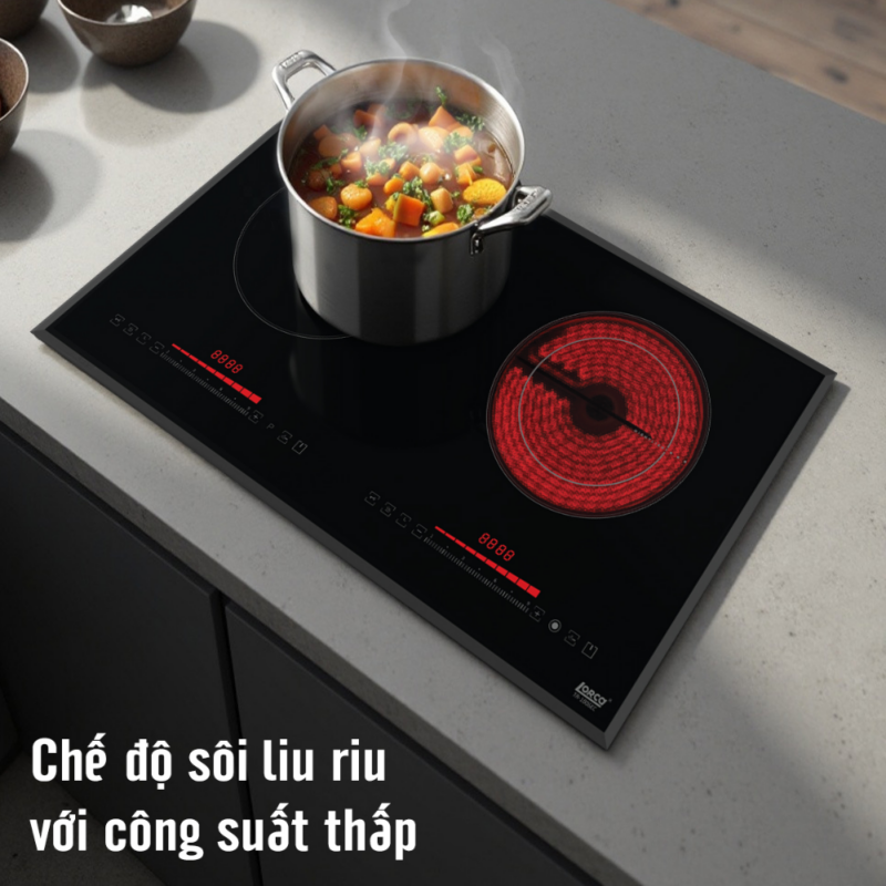 - Thiết kế bếp từ kết hợp hồng ngoại hiện đại với 2 vùng nấu độc lập, cho phép người dùng linh hoạt sử dụng cả nồi đáy từ lẫn các loại nồi chảo thông thường, giúp tối ưu thời gian nấu nướng và mang lại sự tiện lợi tối đa cho các gia đình bận rộn.
