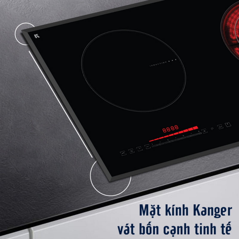 - Mặt kính Kanger cao cấp có khả năng chịu lực, chịu nhiệt vượt trội, bề mặt sáng bóng, chống trầy xước và hạn chế bám bẩn, giúp việc vệ sinh sau khi nấu trở nên nhanh chóng, đồng thời duy trì vẻ đẹp sang trọng cho không gian bếp.
