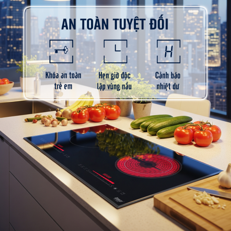 - Trang bị đầy đủ các tính năng an toàn cao cấp, bao gồm khóa trẻ em, cảnh báo nhiệt dư vùng nấu, tự động tắt bếp khi nước tràn sau 10 giây, tự động ngắt khi không có nồi hoặc khi người dùng quên tắt bếp, cùng hệ thống bảo vệ quá nhiệt – quá áp, mang lại sự an tâm tuyệt đối trong suốt quá trình sử dụng.