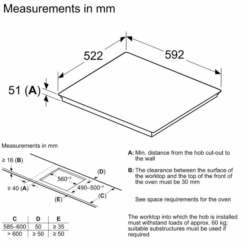 - Kích thước chuẩn, dễ lắp đặt: 51 x 592 x 522 mm, phù hợp với hốc bếp 600 mm, mặt kính gốm thủy tinh màu đen bền đẹp, vát cạnh tinh tế.