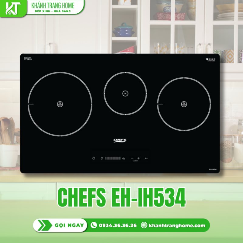 - Bếp từ Chefs EH-IH534 là mẫu bếp từ 3 vùng nấu nổi bật trong phân khúc bếp từ cao cấp, hướng tới những gia đình hiện đại có nhu cầu nấu nướng thường xuyên và yêu cầu cao về hiệu suất, độ an toàn cũng như tính thẩm mỹ. Sản phẩm gây ấn tượng ngay từ thiết kế dài hình chữ nhật, bố trí 3 vùng nấu khoa học, giúp người dùng dễ dàng chế biến nhiều món ăn cùng lúc mà vẫn đảm bảo sự thoải mái khi thao tác.