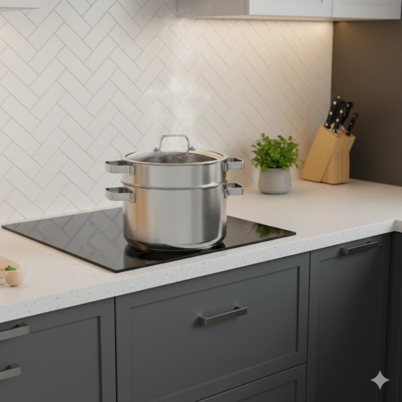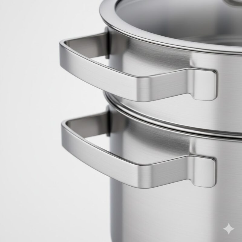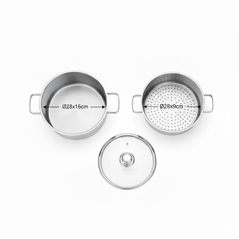 - Thiết kế bộ nồi linh hoạt, có thể lắp ghép để sử dụng cho nhiều mục đích khác nhau như hấp, luộc, nấu canh hay hầm thực phẩm. Khi hấp, hơi nước tỏa đều giúp món ăn chín nhẹ nhàng, giữ trọn hương vị tự nhiên và hạn chế thất thoát dưỡng chất, rất thích hợp cho lối sống ăn uống lành mạnh.