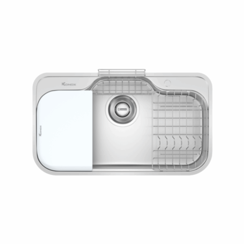 - Thiết kế hiện đại với gờ hạ bậc – tích hợp phụ kiện thông minh: Thớt nhựa, rổ úp bát, siphon