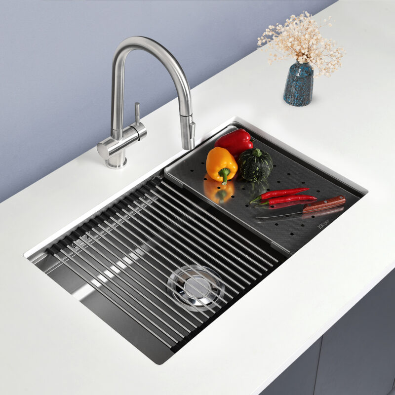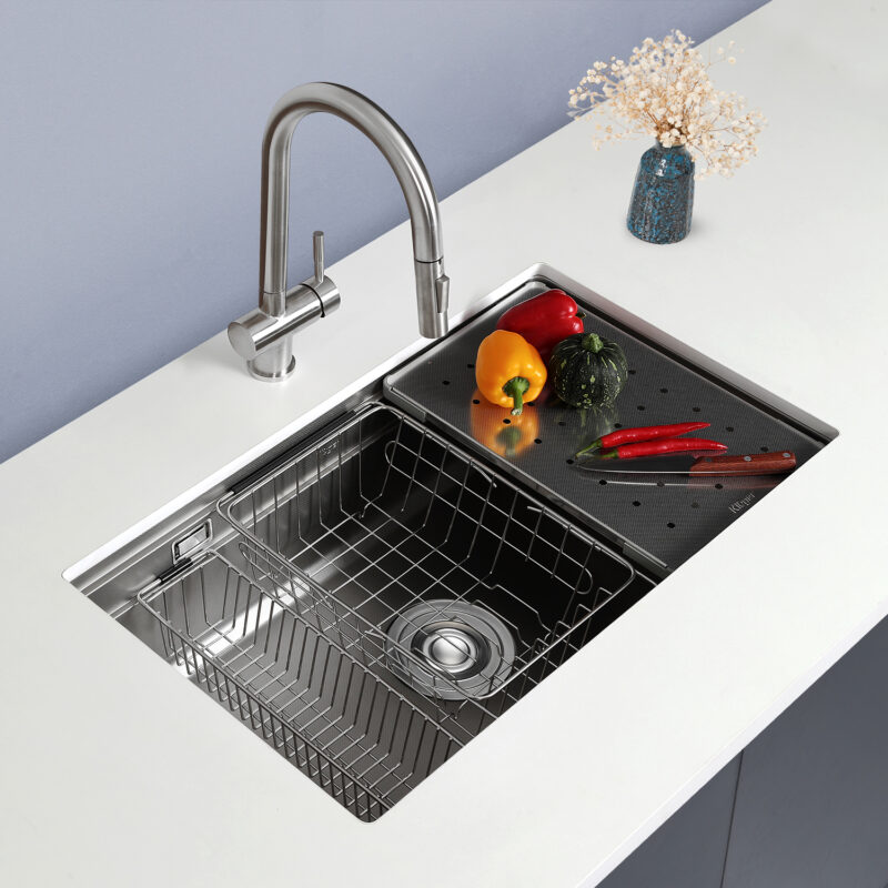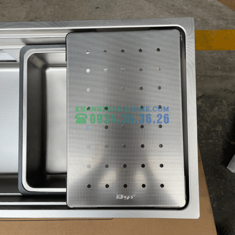- Phiên bản Plus còn tích hợp bộ phụ kiện đồng bộ gồm giỏ inox 304, thớt nhựa, thớt inox, chậu nhỏ… lắp đặt trực tiếp trên đường ray, biến khu vực chậu rửa thành không gian sơ chế đa năng. Hệ thống bát rác 3 lớp đường kính lớn 185 mm đảm bảo thoát nước nhanh, lọc rác hiệu quả và hạn chế tắc nghẽn, giúp chậu luôn khô thoáng và sạch sẽ.