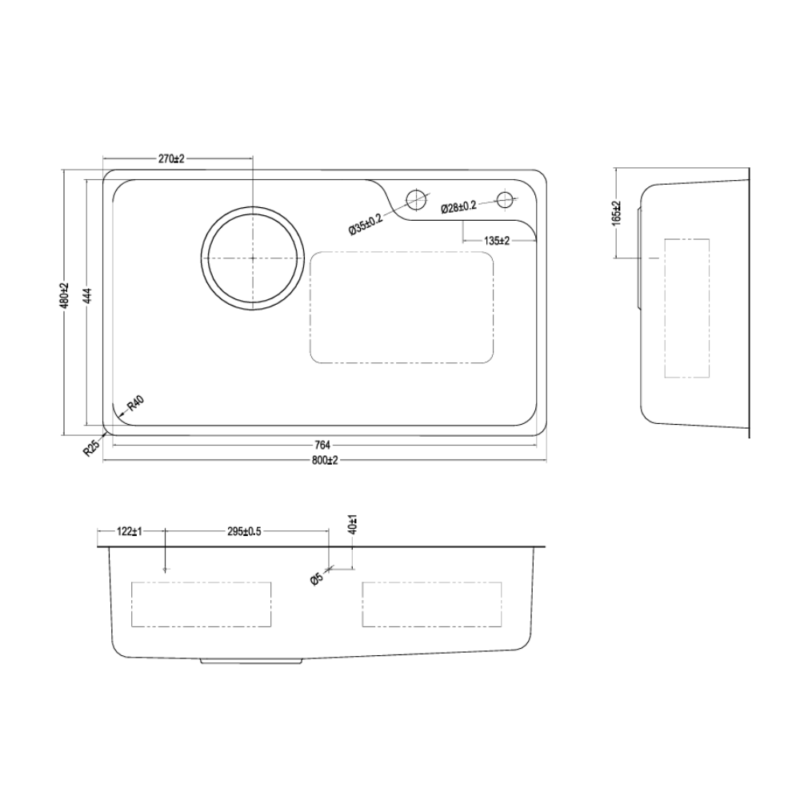 - Kích thước chậu: W800 x D480 x H210 mm (bo góc R25)