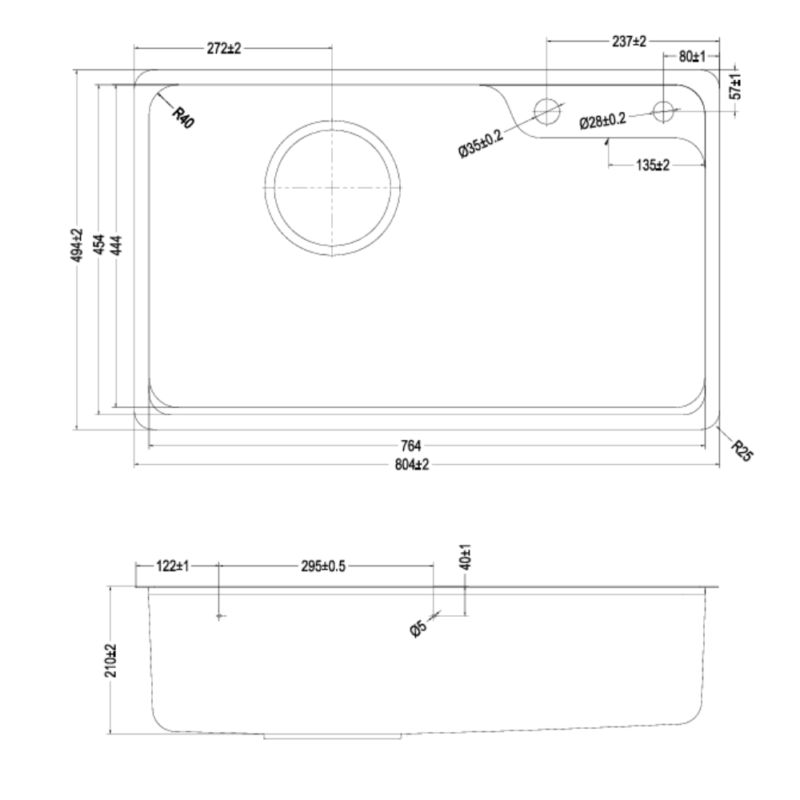 - Kích thước chậu: W800 x D500 x H210 (mm) – 4 x R25