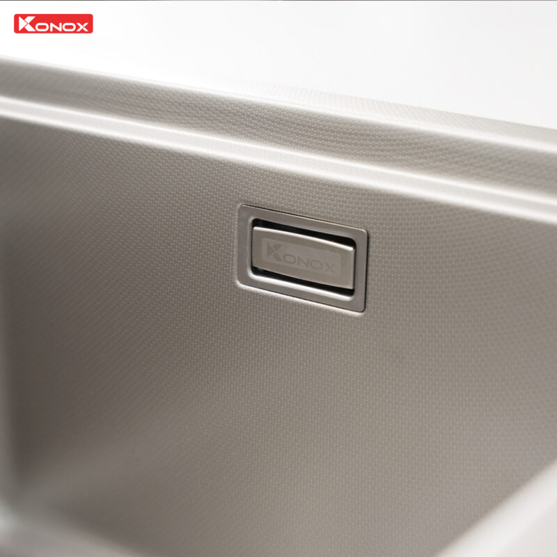 - Bề mặt dập hạt Linen chống xước vượt trội: Công nghệ dập tạo hạt Linen độc quyền của Konox giúp tăng khả năng chống trầy xước, chống mài mòn và chống bám dầu mỡ hiệu quả, phù hợp với nhu cầu sử dụng hàng ngày trong gia đình Việt. Bề mặt này không chỉ bảo vệ chậu mà còn mang lại vẻ sang trọng và đẳng cấp cho gian bếp.
