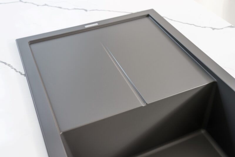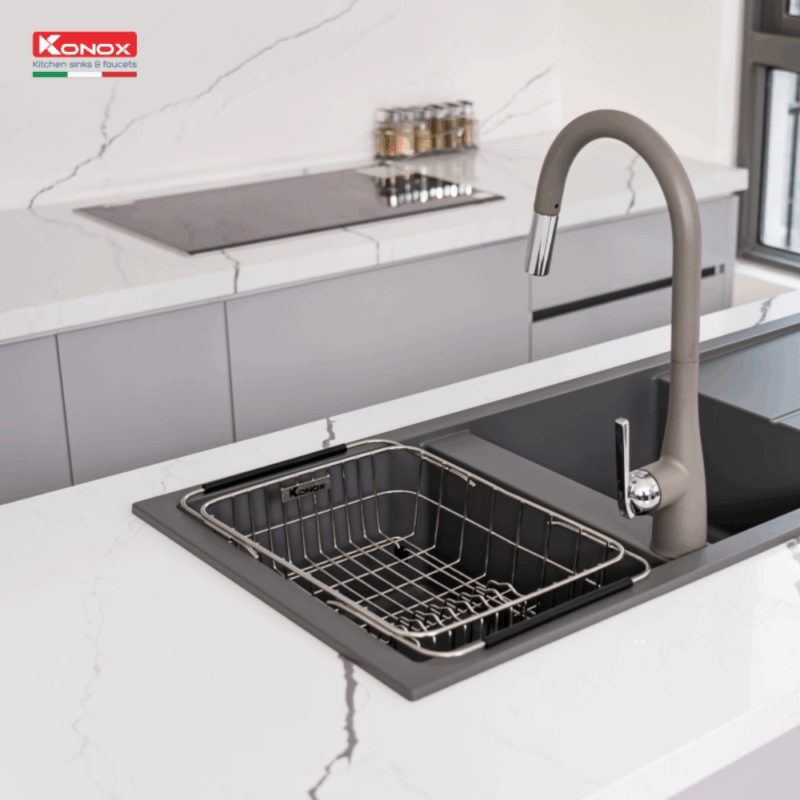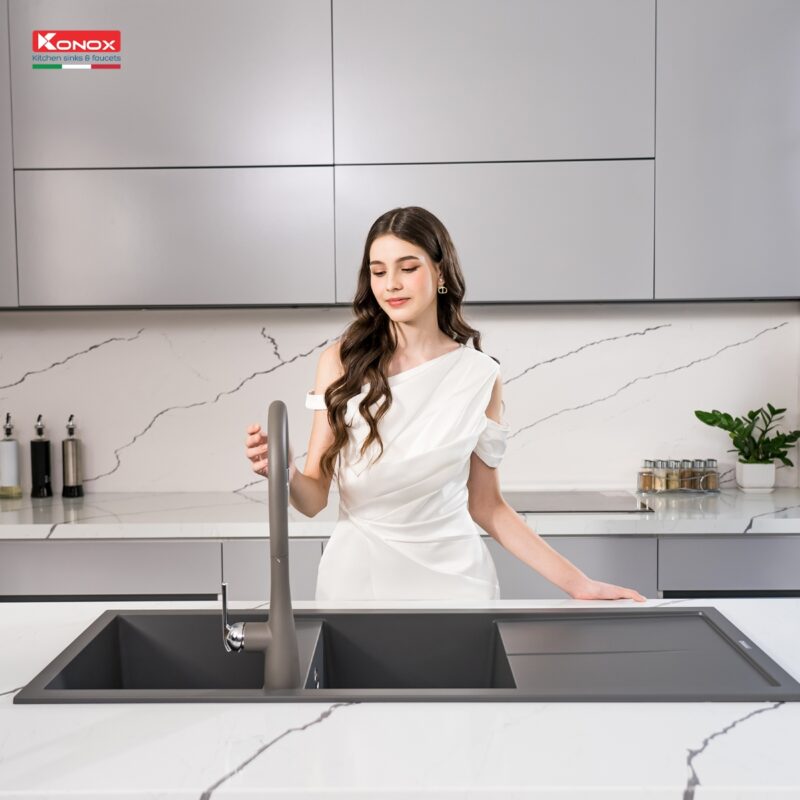 Thiết kế góc bo tròn mềm mại giúp dễ vệ sinh, không đọng cặn bẩn, trong khi bàn chờ rãnh nước mang đến sự tiện lợi khi rửa và để ráo thực phẩm. - Điểm nổi bật của Konox LIVELLO SMART 1160 Grey là khả năng kết hợp hoàn hảo giữa thẩm mỹ tinh tế và công năng vượt trội. Bề mặt mịn, sáng, ít bám bẩn giúp sản phẩm luôn giữ được vẻ đẹp như mới. Cấu trúc đặc chắc, chống nứt vỡ và khả năng chống thấm nước tuyệt đối giúp chậu bền bỉ theo năm tháng, thích hợp với khí hậu và thói quen sử dụng tại Việt Nam.