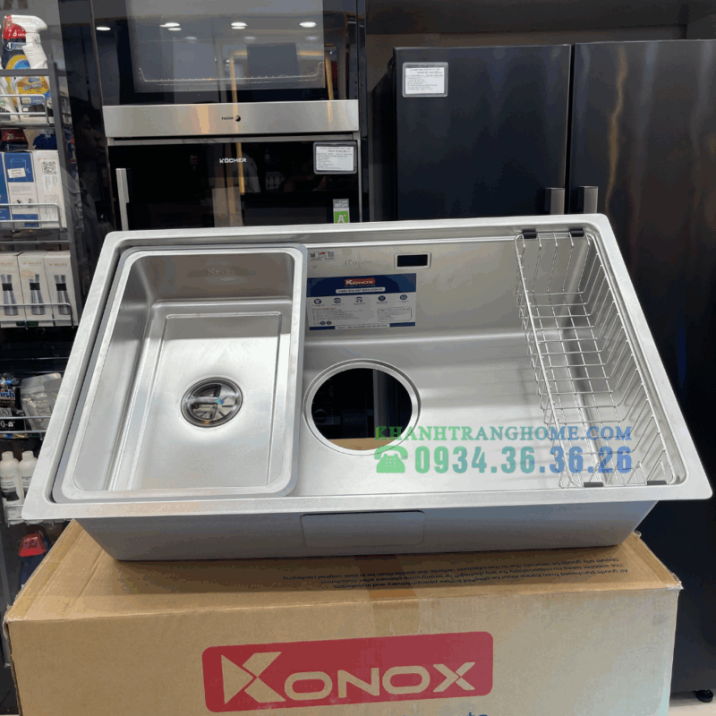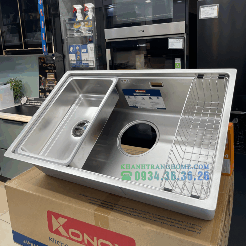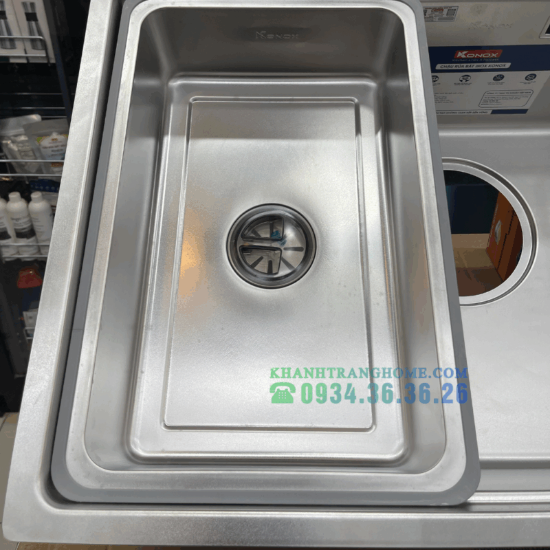 - Bộ phụ kiện thông minh – tiện lợi cho mọi thao tác: Konox trang bị full set phụ kiện gồm thớt nhựa, rổ phụ, siphon và chậu rửa nhỏ tặng kèm, giúp người dùng linh hoạt hơn khi sơ chế, rửa rau củ hoặc dụng cụ nhỏ. Tất cả phụ kiện được thiết kế vừa khít, giúp tối ưu diện tích và tăng hiệu suất làm việc trong bếp.