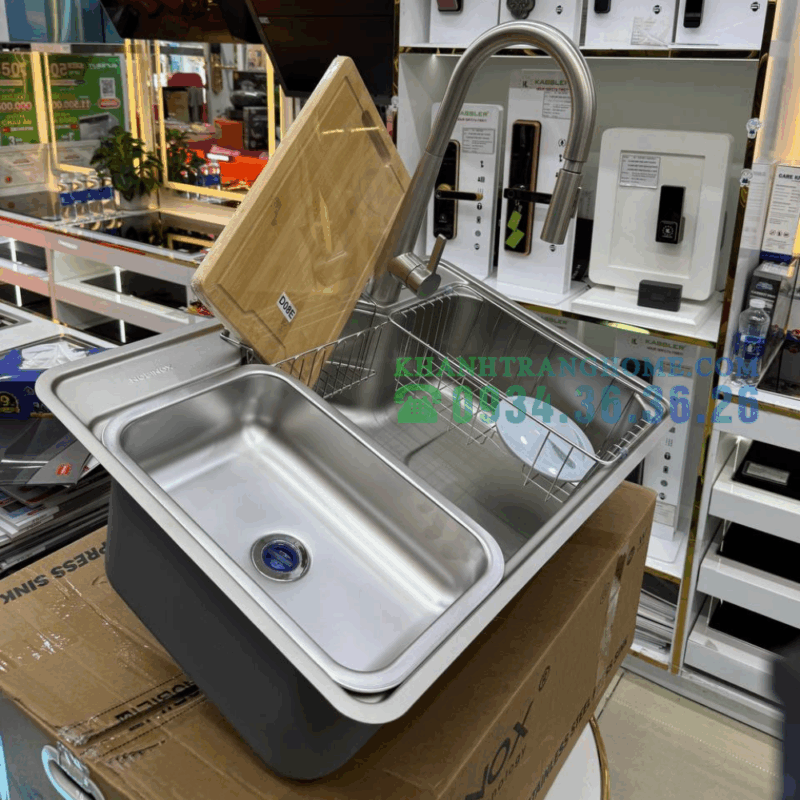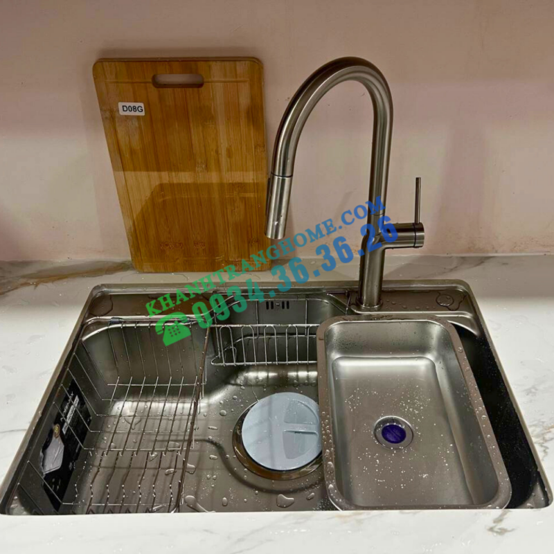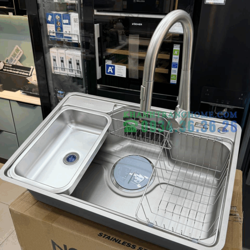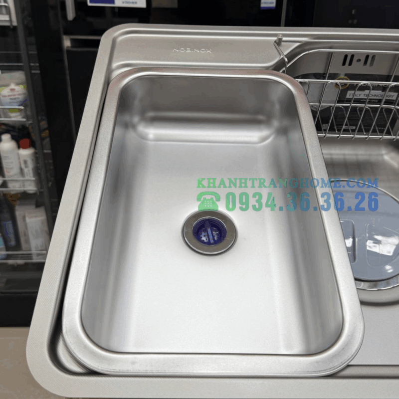 - Ngoài ra, điểm đáng chú ý ở mẫu chậu này là hệ thống thoát nước thông minh với hố rác lớn, bộ lọc 3 lớp và khả năng chống mùi hiệu quả. Lớp chống ồn giúp quá trình rửa bát diễn ra nhẹ nhàng hơn. Phụ kiện đi kèm đầy đủ cũng là một lợi thế cạnh tranh không nhỏ.