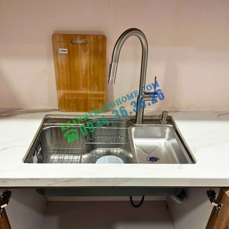 - Trang bị đầy đủ phụ kiện cao cấp: Đi kèm thớt tre, rổ inox, khay inox và bình đựng nước rửa bát – hỗ trợ sơ chế, rửa và sắp xếp khoa học, tiện lợi ngay khi lắp đặt.