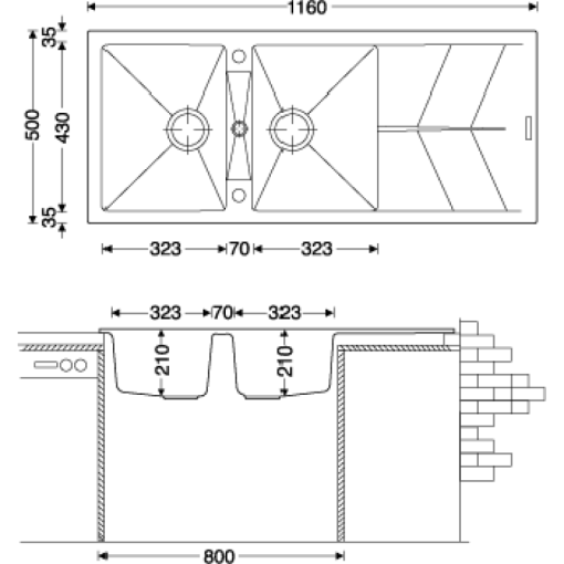 - Kích thước linh hoạt: Chậu có kích thước tổng 1160x500mm, kích thước cắt đá lắp nổi 1140x480mm, và kích thước lòng chậu 323x430mm. Những kích thước này cho phép chậu phù hợp với nhiều không gian bếp khác nhau.