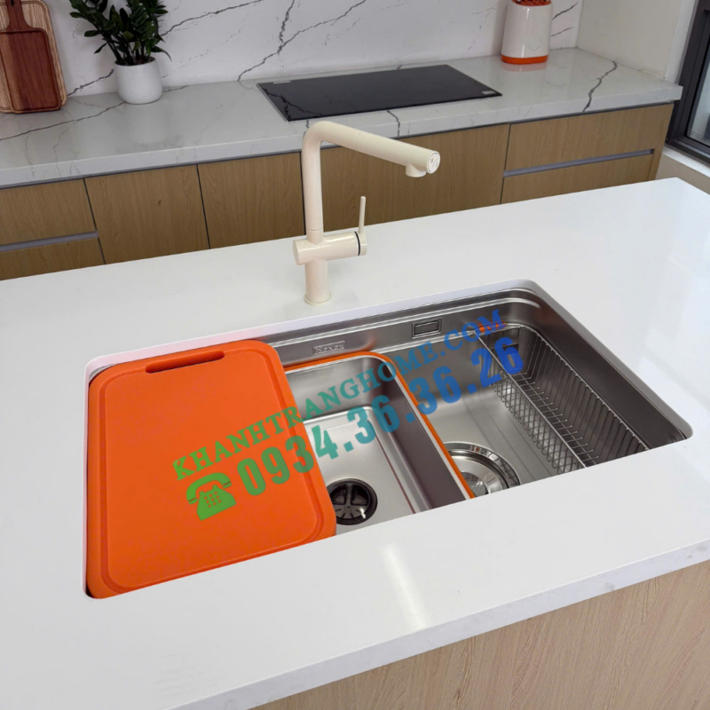- Ngoài ra, sản phẩm còn ghi điểm nhờ full phụ kiện đi kèm gồm thớt nhựa, colander và rổ phụ, hỗ trợ tối đa các thao tác sơ chế và dọn rửa, giúp khu vực bếp gọn gàng và tiện lợi hơn. Chậu cho phép lắp âm, lắp dương hoặc bán âm mặt đá, trong đó lắp âm được nhà sản xuất khuyến nghị để đạt hiệu quả thẩm mỹ cao nhất.