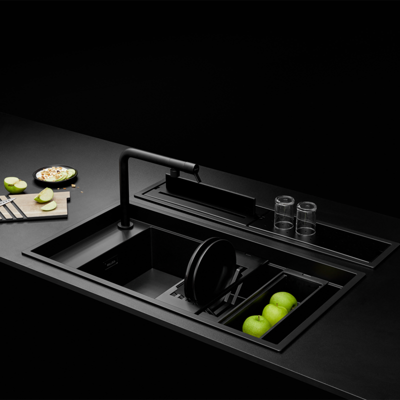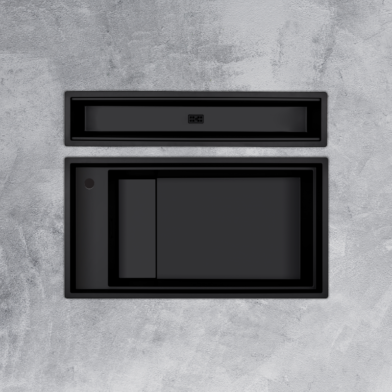 - Kiểu dáng hiện đại, màu đen sang trọng, dễ phối hợp với nhiều phong cách bếp khác nhau từ hiện đại đến tối giản. Chậu có thể lắp nổi hoặc lắp âm, linh hoạt theo nhu cầu thiết kế không gian bếp.