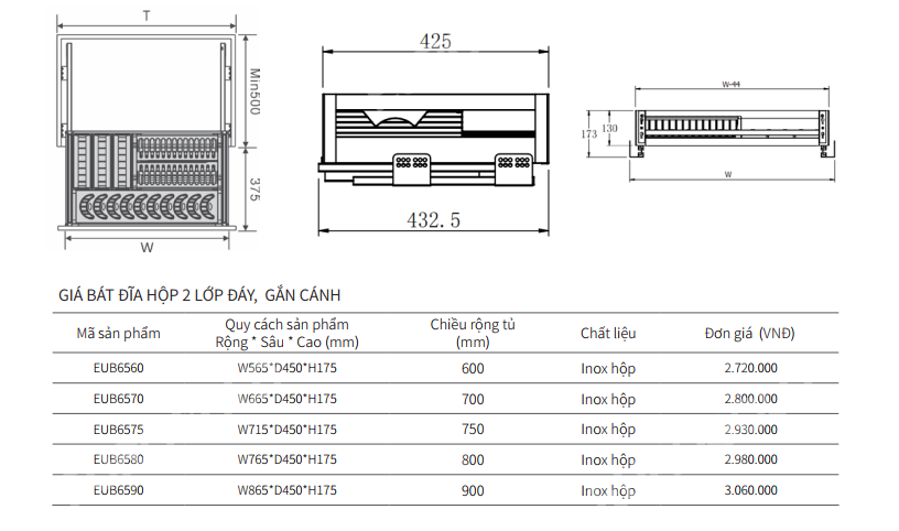 - Giá bát đĩa hộp 2 lớp đáy gắn cánh Eurogold EUB6560 được thiết kế theo phong cách âm tủ hiện đại, mang lại sự gọn gàng và đồng bộ cho không gian bếp. Với kích thước W565D450H175mm, sản phẩm lắp đặt vừa vặn trong khoang tủ rộng 600mm, giúp tối ưu diện tích lưu trữ mà vẫn đảm bảo sự thuận tiện khi sử dụng. Tổng thể thiết kế vuông vắn, chắc chắn, phù hợp với các hệ tủ bếp cao cấp.