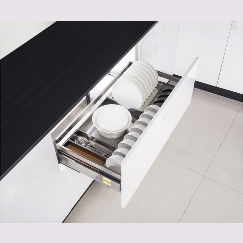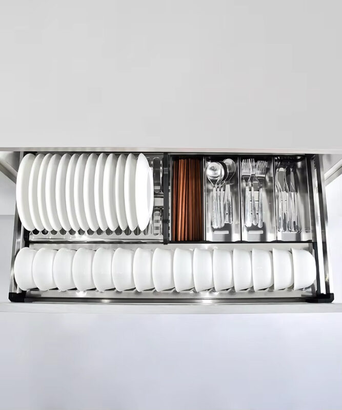 - Thiết kế 2 lớp đáy giúp việc sắp xếp bát, đĩa trở nên khoa học và ngăn nắp hơn, hạn chế va chạm trong quá trình lưu trữ. Không gian được phân chia hợp lý giúp người dùng dễ dàng quan sát và lấy đồ dùng khi cần. Hệ ray giảm chấn cao cấp cho thao tác đóng mở êm ái, nhẹ nhàng và an toàn, kể cả khi lưu trữ nhiều bát đĩa.