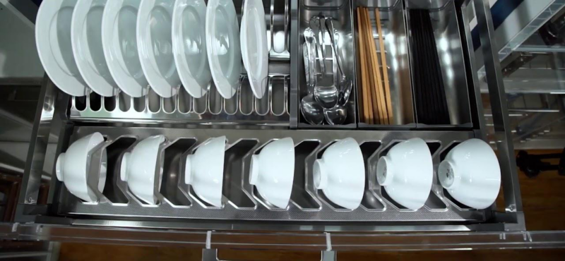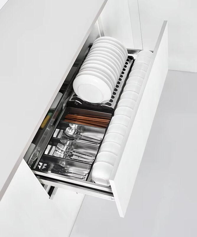 Hệ ray giảm chấn cao cấp cho chuyển động đóng mở nhẹ nhàng, êm ái và hạn chế tiếng ồn. Ray có khả năng chịu tải tốt, đáp ứng nhu cầu lưu trữ nhiều bát đĩa cùng lúc mà vẫn vận hành ổn định. Điều này giúp nâng cao trải nghiệm sử dụng và tăng tuổi thọ cho tủ bếp. - Linh hoạt lắp đặt – Dễ dàng sử dụng