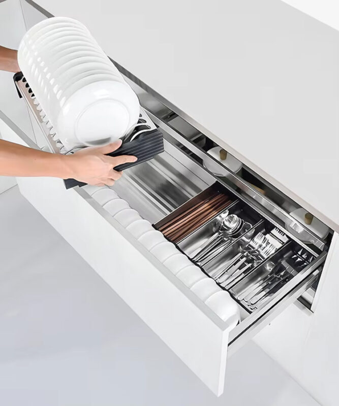 - Giá bát đĩa hộp Eurogold EUB6590 được thiết kế dành cho khoang tủ 900mm, mang đến giải pháp lưu trữ rộng rãi và gọn gàng cho không gian bếp hiện đại. Thiết kế âm tủ gắn cánh giúp toàn bộ hệ giá được giấu kín sau cánh tủ, tạo cảm giác liền mạch, sang trọng và đồng bộ với tổng thể nội thất. Kiểu dáng hộp vuông vắn phù hợp với xu hướng bếp tối giản và cao cấp hiện nay.