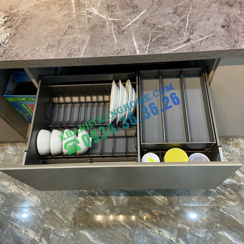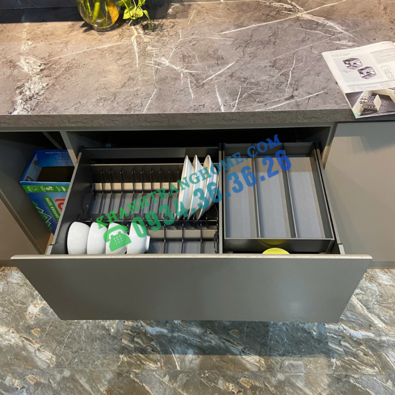 - Thiết kế linh hoạt, tiện dụng: Tích hợp hộc kéo con bên trong, giúp tối ưu không gian lưu trữ bát đĩa, cốc, thìa, đồng thời chống trượt, chống va đập hiệu quả.
