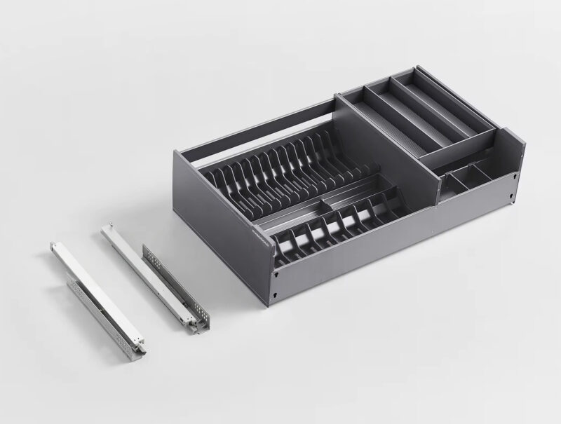 Giá bát đĩa EMG7560 được trang bị hệ ray trượt giảm chấn HURMAR tiêu chuẩn Đức, giúp thao tác kéo ra – đẩy vào nhẹ nhàng, không gây tiếng ồn, đồng thời chịu tải tốt và vận hành ổn định trong thời gian dài.