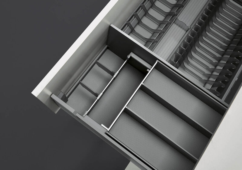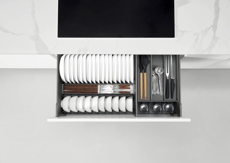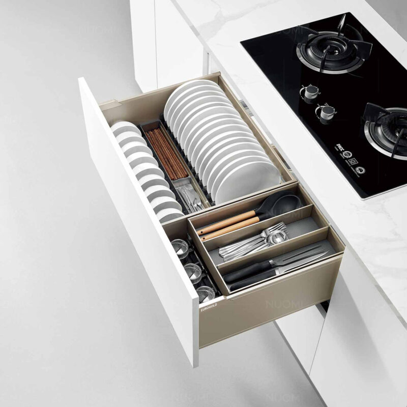 - Hệ thống ray trượt giảm chấn mang lại trải nghiệm sử dụng êm ái, nhẹ nhàng và an toàn. Việc kéo ra, đẩy vào diễn ra mượt mà, không gây tiếng ồn, góp phần nâng cao sự thoải mái trong sinh hoạt hàng ngày.
