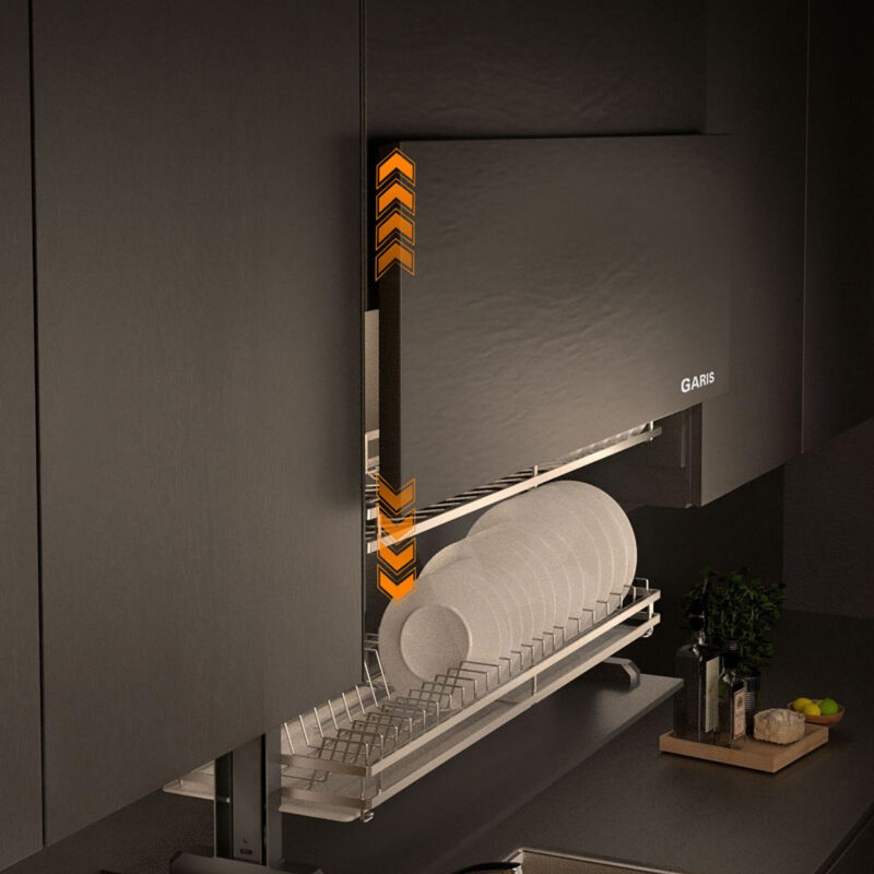 - Tên sản phẩm: Giá bát đĩa nâng hạ điện cơ cấu cánh mở trượt lên Garis GL06.9LP