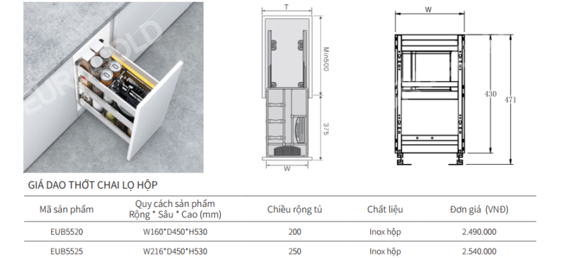 - Giá dao thớt chai lọ Eurogold EUB5525 là giải pháp lưu trữ tiện lợi dành cho những căn bếp hiện đại, đặc biệt phù hợp với khoang tủ rộng 250mm. Thiết kế gọn gàng giúp tận dụng tối đa không gian bên trong tủ bếp, mang lại sự ngăn nắp và thuận tiện trong quá trình nấu nướng, đồng thời góp phần nâng cao tính thẩm mỹ cho tổng thể không gian bếp.