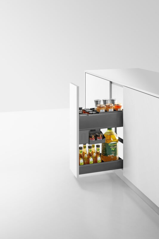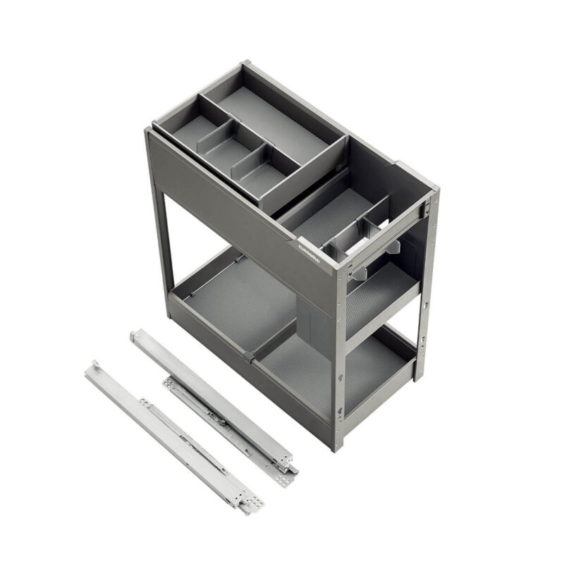 Sản phẩm được thiết kế dành cho khoang tủ dưới rộng 400 mm, giúp tận dụng tối đa diện tích lưu trữ mà không gây vướng víu. Kiểu dáng gọn gàng và khoa học giúp bạn sắp xếp chai lọ, gia vị một cách ngăn nắp và dễ tiếp cận.