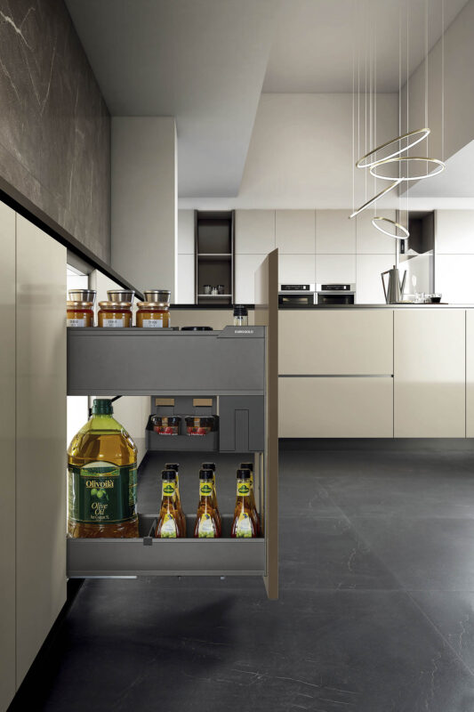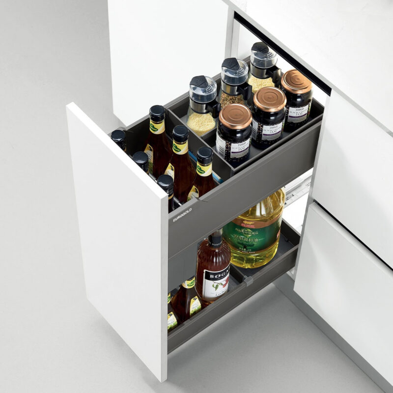 - Hệ thống ray trượt giảm chấn chất lượng cao giúp giá vận hành êm ái và nhẹ nhàng khi kéo ra – đẩy vào, hạn chế tiếng ồn và rung lắc. Cơ chế này mang lại cảm giác sử dụng thoải mái và thân thiện, đồng thời bảo vệ các chai lọ và hộp gia vị bên trong khỏi va đập mạnh.