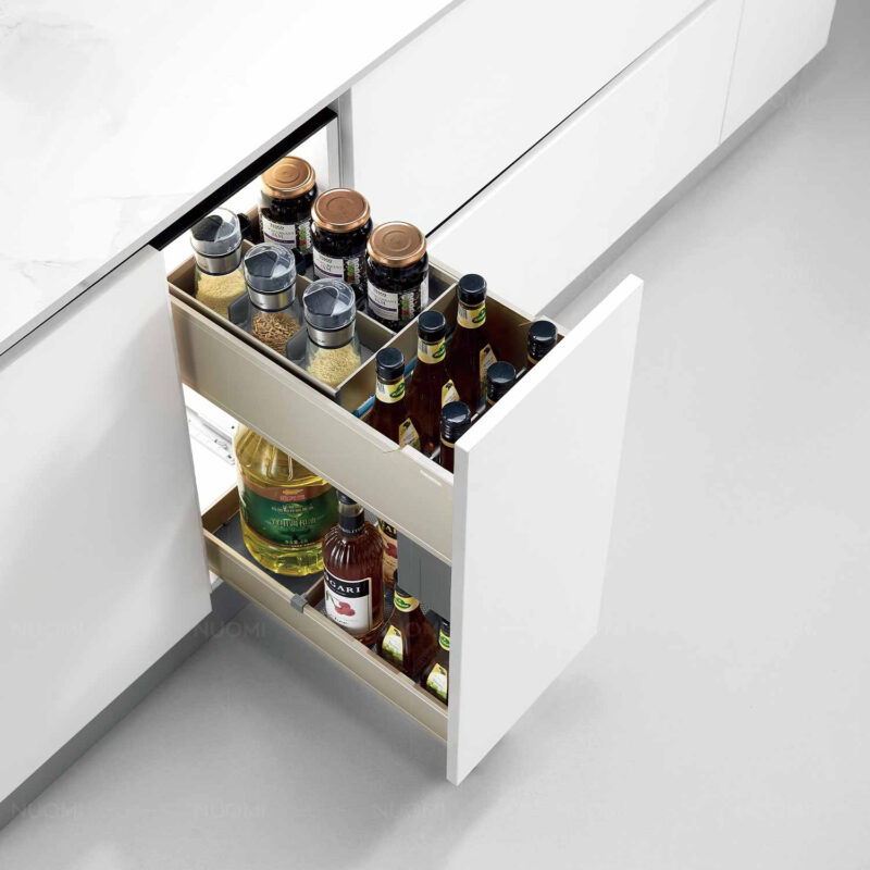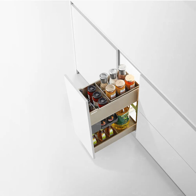 Sản phẩm có thiết kế dạng hộp gọn gàng, phù hợp lắp đặt trong khoang tủ dưới 300mm, giúp tận dụng tối đa diện tích lưu trữ mà không gây cảm giác chật chội. Cách bố trí khoa học giúp chai lọ, gia vị được sắp xếp ngăn nắp và dễ dàng lấy ra khi cần.