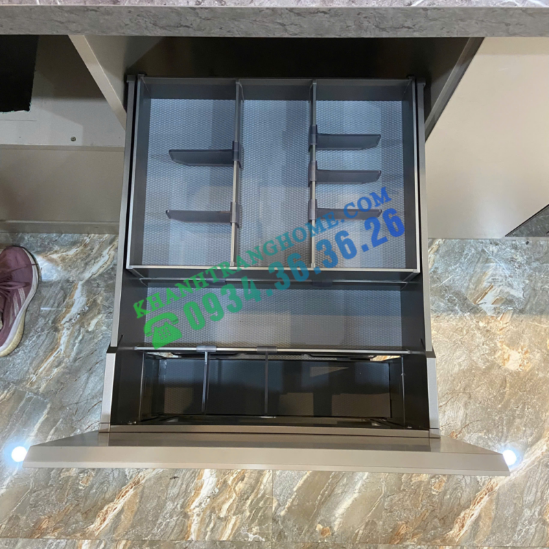 - Thiết kế tối ưu không gian: Ngăn kéo ẩn thông minh giúp tối ưu diện tích tủ bếp, khay chứa linh hoạt sắp xếp được nhiều gia vị, chai lọ với kích thước khác nhau.