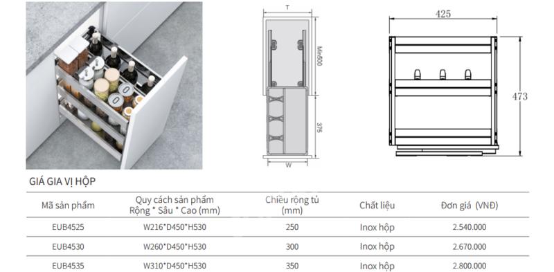 - Tổng thể, giá gia vị hộp Eurogold EUB4535 không chỉ là giải pháp tối ưu hóa không gian tủ bếp mà còn góp phần nâng cao tính thẩm mỹ và tiện nghi cho căn bếp. Với thiết kế chuẩn tủ, chất liệu bền bỉ và khả năng lưu trữ hiệu quả, sản phẩm là lựa chọn phù hợp cho những gia đình yêu cầu sự gọn gàng, hiện đại và tiện lợi trong sinh hoạt bếp núc hằng ngày.