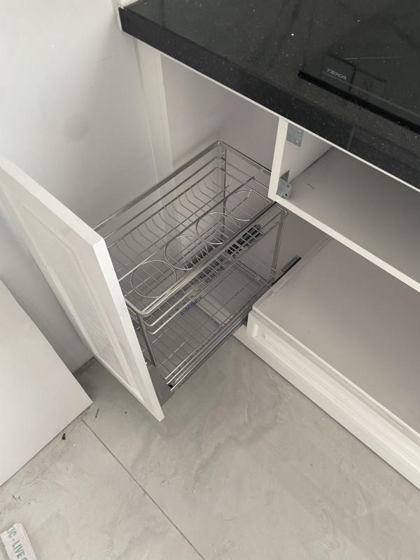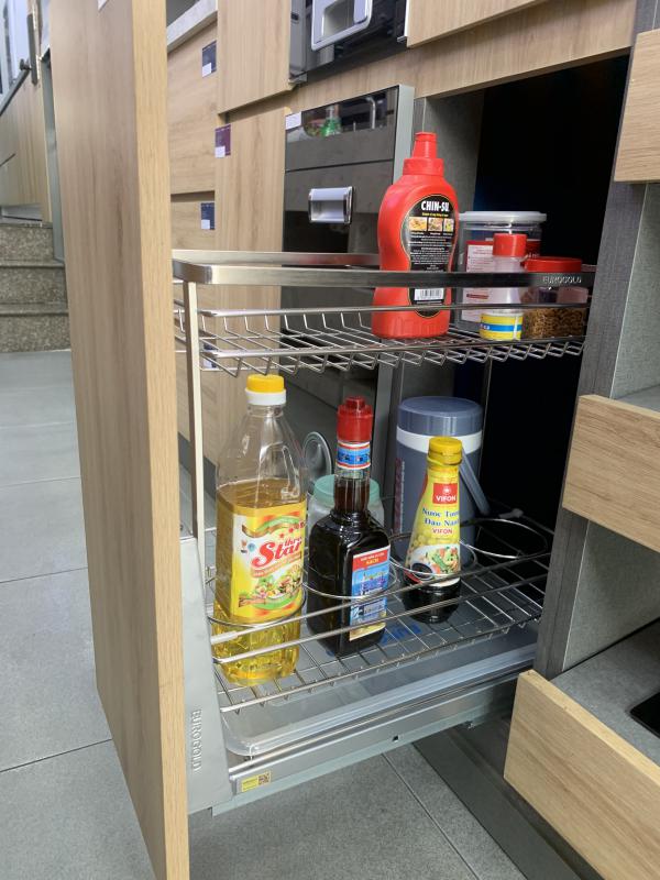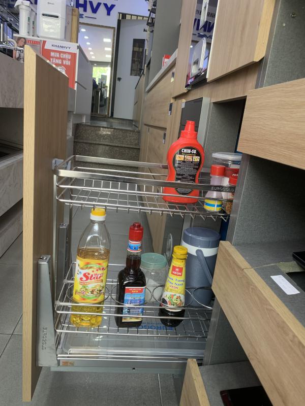 Thiết kế 2 tầng thông minh cho phép sắp xếp nhiều loại chai lọ gia vị một cách ngăn nắp và dễ quan sát. Các vật dụng được bố trí hợp lý, thuận tiện khi lấy và cất trong quá trình nấu nướng. Không gian bên trong tủ bếp được tận dụng tối đa nhưng vẫn đảm bảo sự thông thoáng. - Tải trọng tốt, phù hợp nhiều loại chai lọ