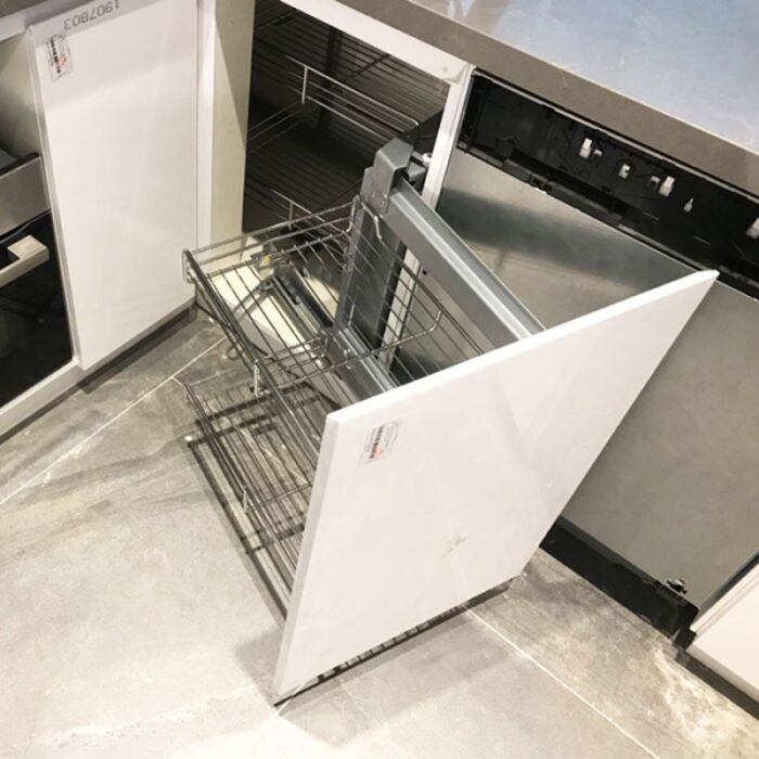 Sản phẩm có thiết kế linh hoạt, thích ứng với các hướng góc khác nhau và được tối ưu cho góc mở phải (R), giúp người dùng dễ dàng lựa chọn phù hợp với bố cục bếp. Cơ cấu liên hoàn cho phép các khay trượt ra ngoài đồng bộ khi mở cánh, giúp việc lấy đồ ở phía trong trở nên đơn giản và nhẹ nhàng hơn. - Chất liệu inox 304 cao cấp – Bền bỉ, an toàn