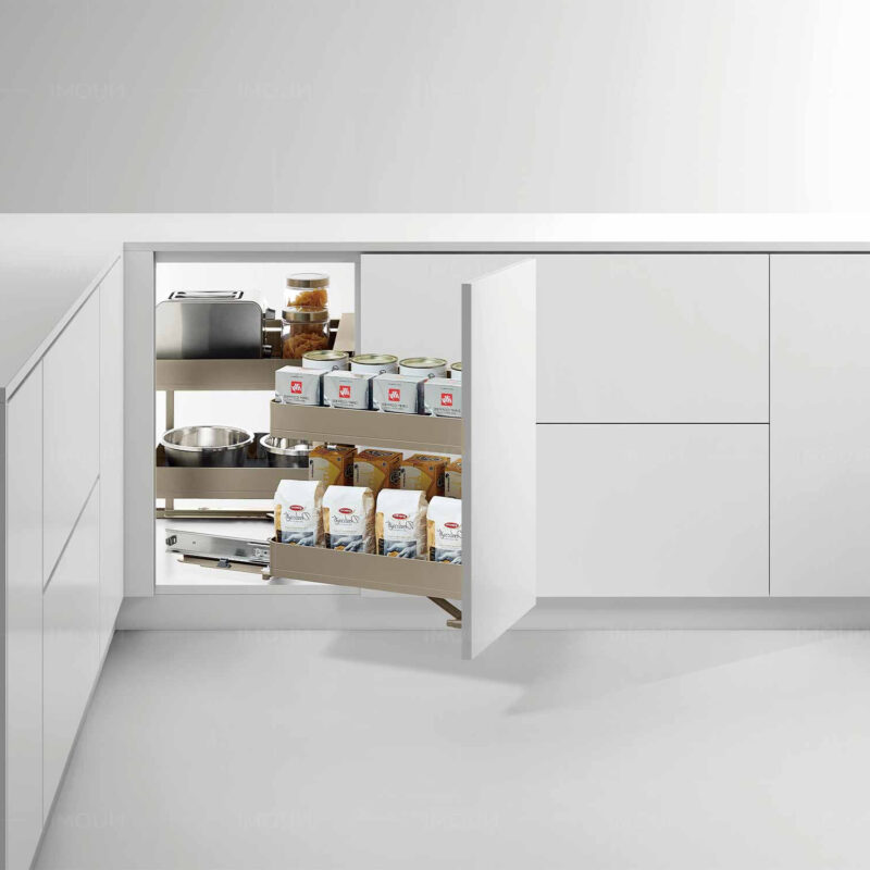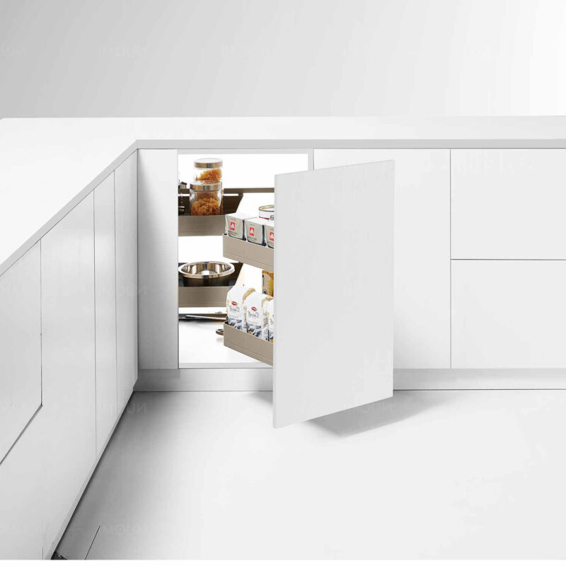- Ứng dụng: Lưu trữ xoong nồi, chai lọ, gia vị, đồ khô trong góc tủ bếp dưới
