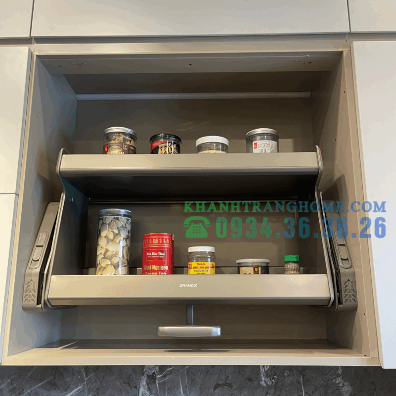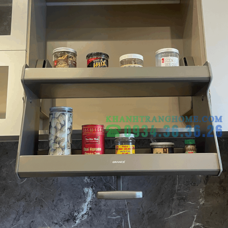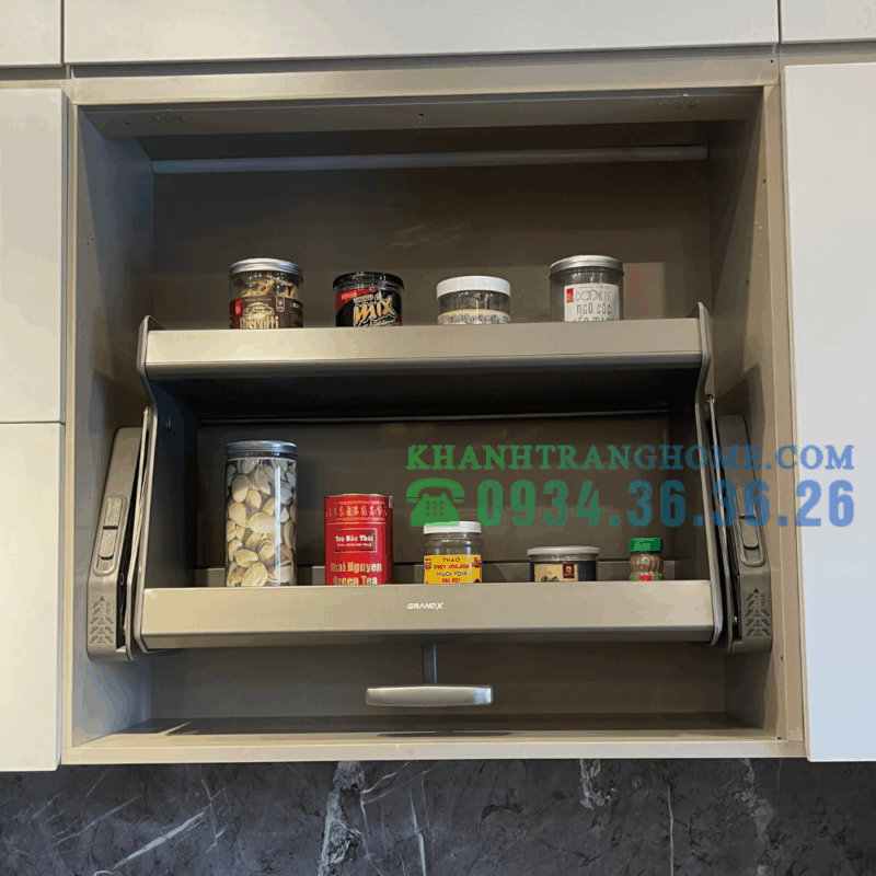 - Giá nâng hạ 2 tầng GrandX XL.90T là một trong những phụ kiện tủ bếp thông minh, giúp người dùng tiếp cận dễ dàng các vật dụng ở ngăn tủ trên cao. Với hệ thống nâng hạ cơ học kết hợp trợ lực, sản phẩm cho phép thao tác nhẹ nhàng mà không tốn nhiều sức. Thiết kế tay nắm bầu dục không chỉ tạo sự thoải mái khi sử dụng mà còn tăng tính thẩm mỹ cho không gian bếp.