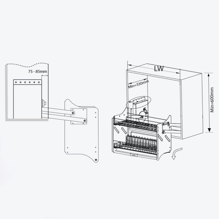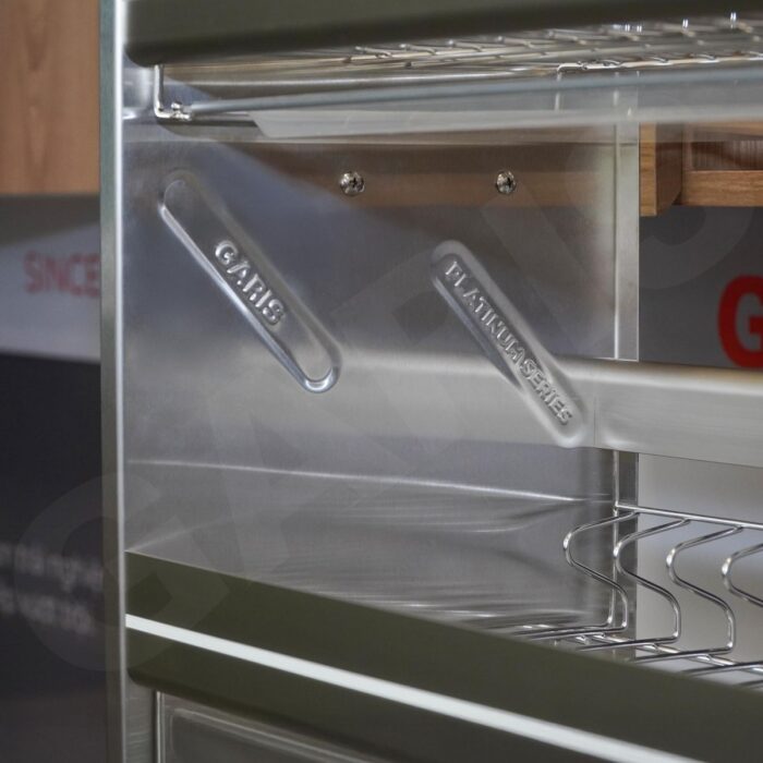 GIÁ NHÔM NÂNG HẠ BÁT ĐĨA GARIS GL06.90AG - Cơ chế nâng hạ linh hoạt giúp người dùng dễ dàng thao tác khi lấy hoặc cất bát đĩa, đặc biệt thuận tiện với tủ bếp trên cao. Quá trình vận hành diễn ra êm ái, hạn chế rung lắc, mang lại cảm giác chắc chắn và an toàn khi sử dụng.