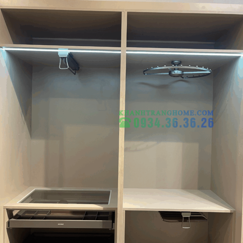 - Cơ chế xoay 360° tiện dụng: Với vòng xoay bán nguyệt 270°, người dùng có thể quay tròn 360° để thao tác lấy hoặc treo đồ ở những vị trí khó tiếp cận – cực kỳ phù hợp cho các tủ quần áo góc hoặc tủ âm tường cao cấp.