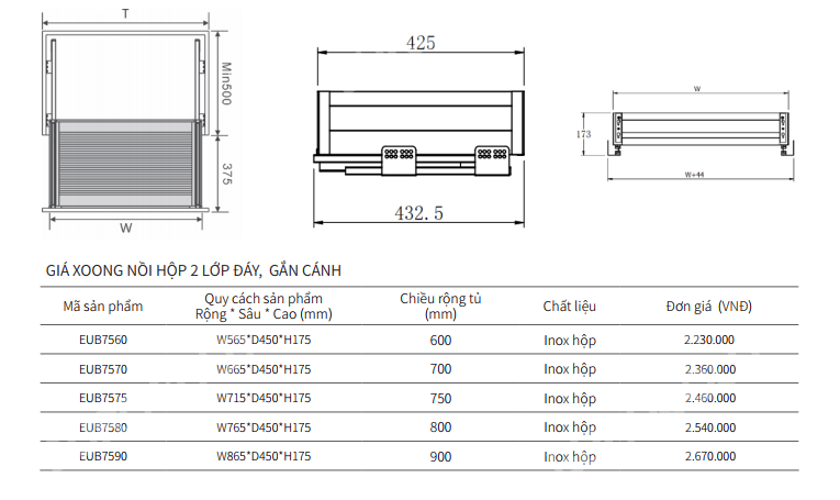 - Giá xoong nồi hộp 2 lớp đáy gắn cánh Eurogold EUB7575 được thiết kế theo dạng âm tủ hiện đại, mang lại sự gọn gàng và đồng bộ cho không gian bếp. Với kích thước W715D450H175mm, sản phẩm phù hợp lắp đặt trong khoang tủ rộng 750mm, giúp tối ưu diện tích lưu trữ mà vẫn đảm bảo sự thuận tiện khi sử dụng. Kiểu dáng vuông vắn, chắc chắn góp phần tạo nên tổng thể bếp tinh tế và chuyên nghiệp.