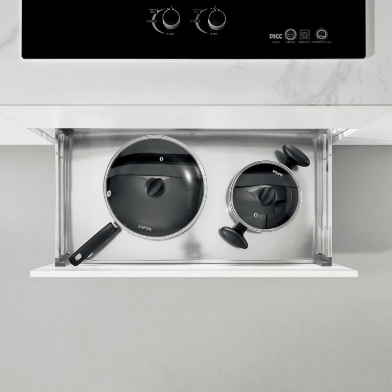 - Thiết kế 2 lớp đáy giúp việc sắp xếp xoong, nồi, chảo trở nên khoa học và ngăn nắp hơn. Không gian lưu trữ được phân chia hợp lý, hỗ trợ người dùng dễ dàng quan sát và lấy đồ dùng bếp khi cần. Hệ ray giảm chấn cao cấp giúp thao tác đóng mở nhẹ nhàng, êm ái, đảm bảo an toàn ngay cả khi chứa nhiều vật dụng nặng.