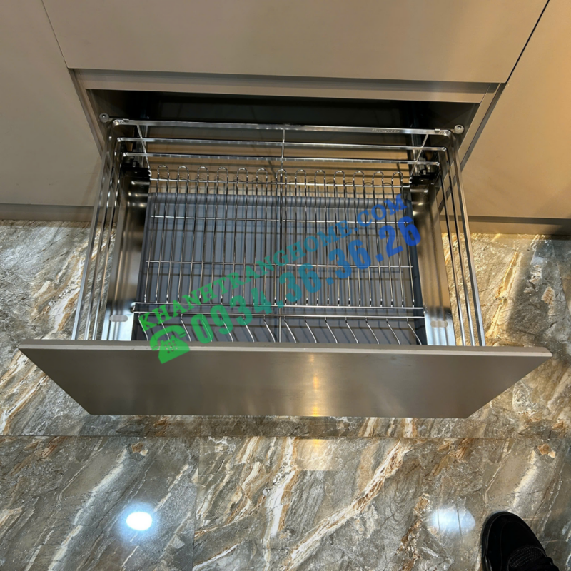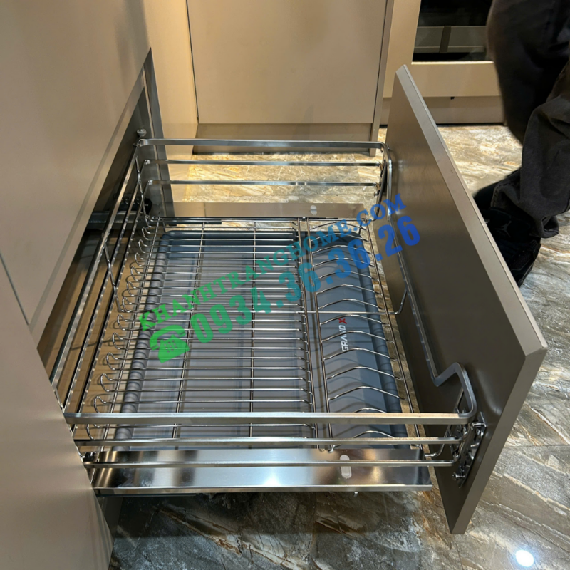 - Khay nhựa ABS xám mờ có nẹp nhôm chống tràn nước, giữ tủ bếp luôn khô ráo và sạch sẽ.