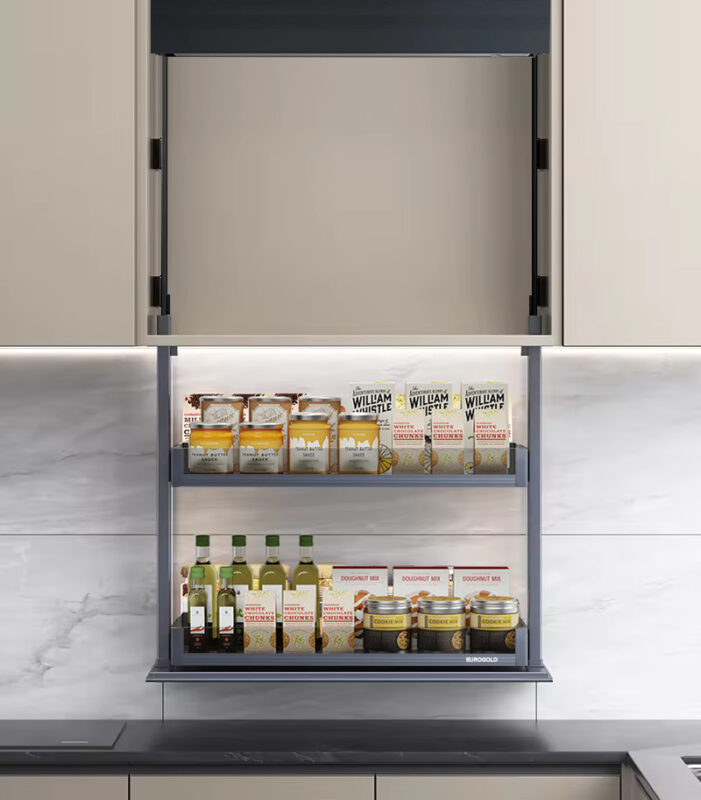 - Khả năng chịu tải tốt cho phép kệ lưu trữ được nhiều chai lọ, gia vị và đồ khô mà vẫn vận hành ổn định. Hệ thống ray trượt và cơ cấu nâng hạ hoạt động êm ái, hạn chế tiếng ồn và rung lắc, mang lại sự an tâm trong quá trình sử dụng lâu dài.