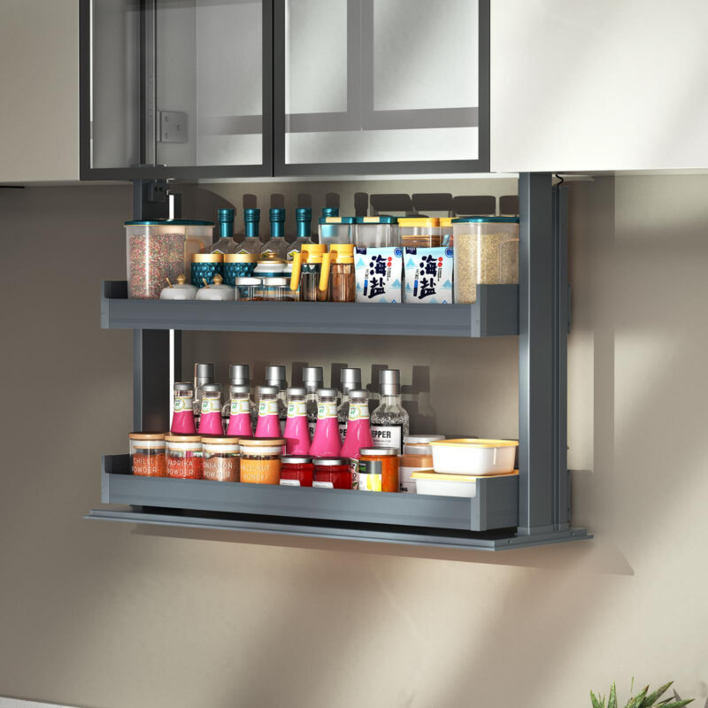 - Thiết kế của sản phẩm sử dụng chất liệu hợp kim nhôm cao cấp, xử lý bề mặt bằng công nghệ phủ Fluoro Carbon màu ghi đậm, mang lại độ bền bỉ và khả năng chống ăn mòn, han gỉ hiệu quả trong môi trường bếp ẩm ướt. Khay đựng gia vị được bố trí hai tầng rộng rãi, phù hợp với nhiều kích thước chai lọ và đồ khô khác nhau, giúp không gian tủ bếp luôn gọn gàng và ngăn nắp.