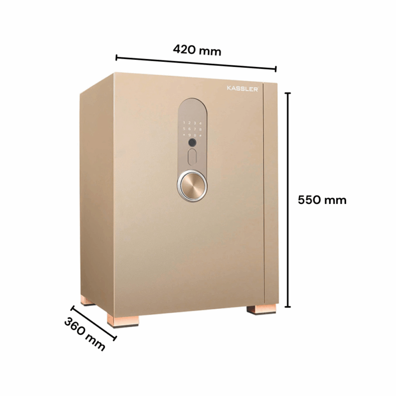 - Kích thước gọn gàng – phù hợp nhiều không gian: Với kích thước 550 x 420 x 360 mm và trọng lượng 53kg, Kassler KL-55H8 Gold Sand dễ dàng bố trí trong tủ, góc phòng hay bàn làm việc mà vẫn đảm bảo tính thẩm mỹ và bảo mật.