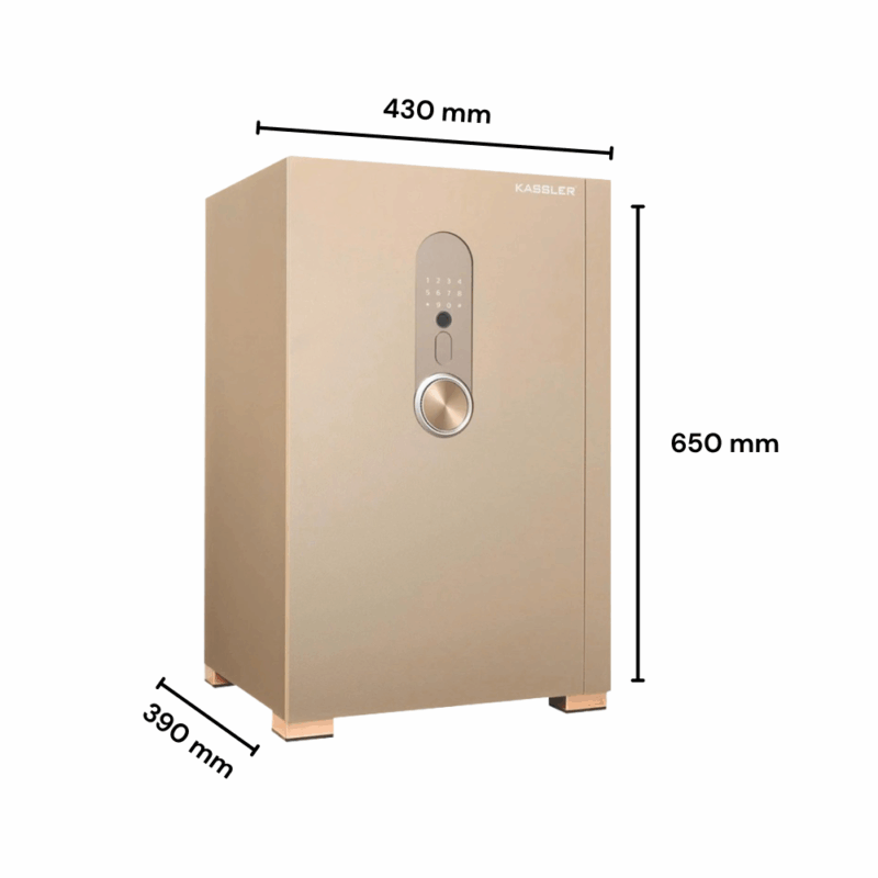 - Về thiết kế, Kassler KL-65H8 Gold mang gam màu Gold Sand ánh kim sang trọng, thân két vuông vức chắc chắn, tạo điểm nhấn đẳng cấp cho phòng làm việc, biệt thự hay văn phòng cao cấp.