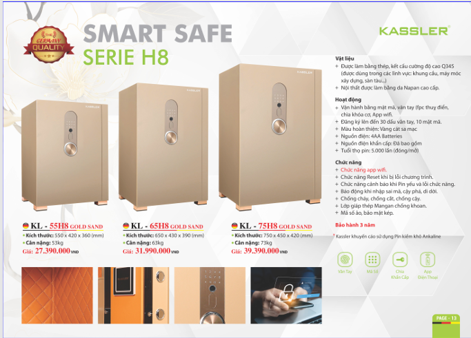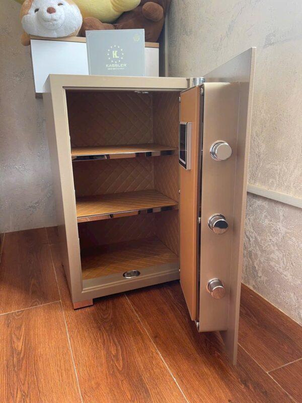 - Két sắt KASSLER KL-65H8 Gold thuộc dòng Smart Safe Serie H8 cao cấp của thương hiệu Kassler – một trong những nhà sản xuất két sắt thông minh hàng đầu đến từ Đức. Sản phẩm được thiết kế tinh xảo, tích hợp nhiều công nghệ hiện đại, mang lại độ an toàn tối đa cho tài sản của bạn trong khi vẫn giữ được vẻ sang trọng, đẳng cấp cho không gian sống.