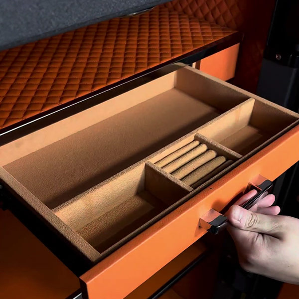 - 5 ngăn + 1 ngăn kéo bọc nỉ, có khóa phụ, chia ngăn khoa học.