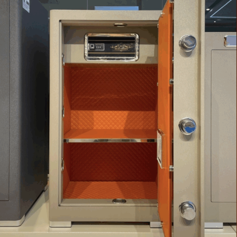 Về lưu trữ, với trọng lượng khoảng 105 ± 5 kg, LB88S cung cấp không gian bên trong rộng rãi. Kích thước ngoài khoảng 880 × 500 × 460 mm, kích thước bên trong khoảng 820 × 470 × 360 mm. Két chia làm 2 ngăn: ngăn phụ phía trên (160 × 470 × 290 mm) và ngăn chính rộng lớn có đợt chia linh hoạt. Nội thất được lót da PU màu cam, chống ẩm và bảo vệ tài sản khỏi trầy xước.
