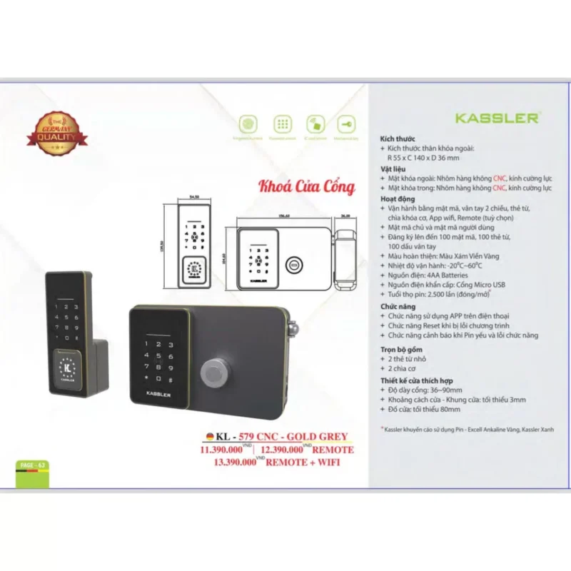 THÔNG SỐ KỸ THUẬT Khóa cửa cổng Kassler KL-579 CNC GOLD GREY APP