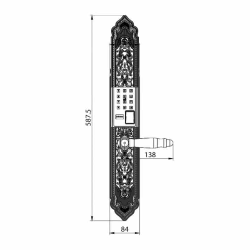 - Kích thước: Kích thước thần khóa ngoài (Rộng x Cao x Dày): R 84,5 x C 587 x D 34 mm